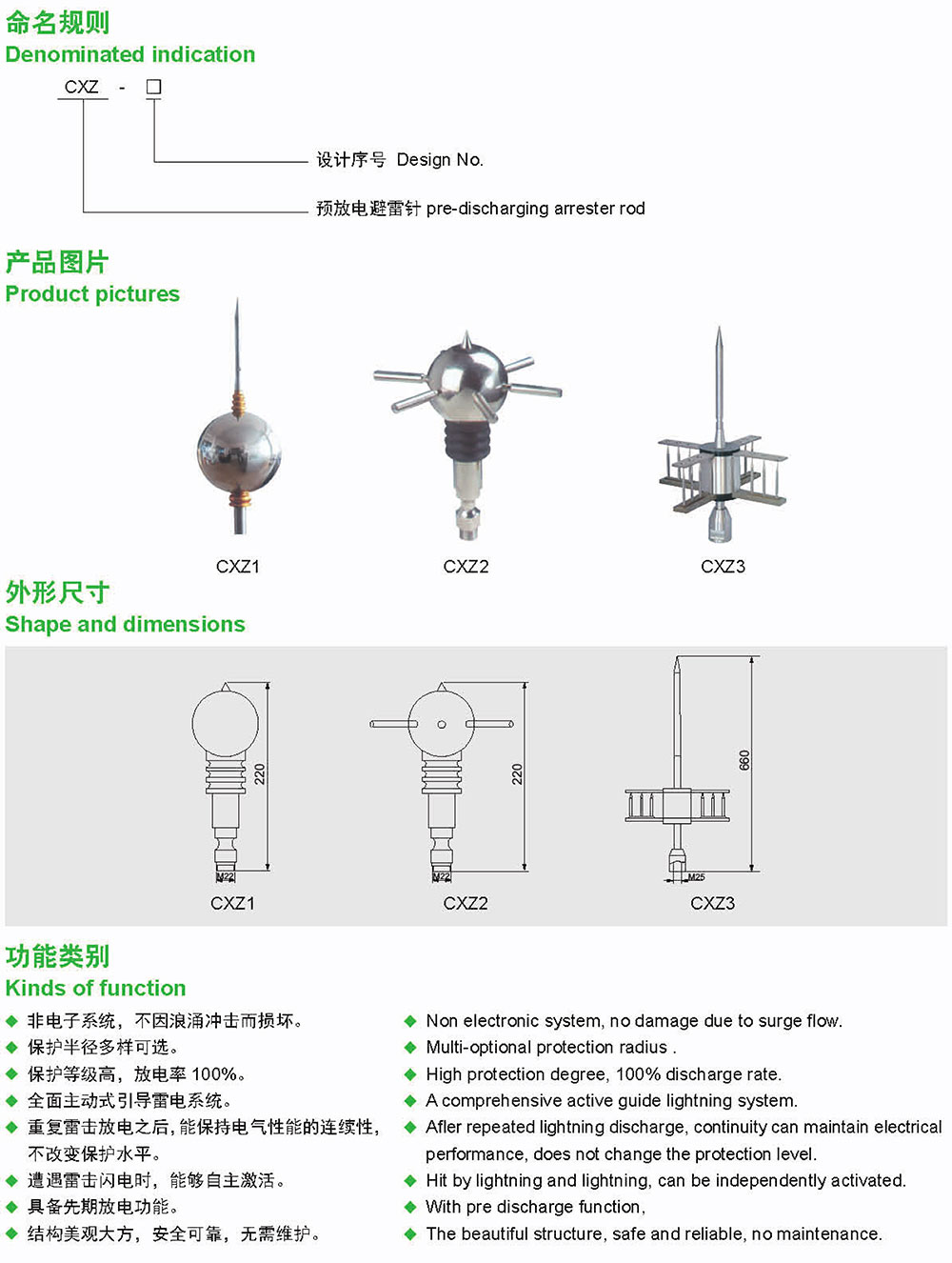 Products:CXZ series as ionization discharge lightning rod, is on the basis of the traditional principle of discharge, the introduction of "promote the ionization" the basic characteristics of the pre discharge lightning rod, thus achiaved more than ordinary lightning rod as early as the forerunner of discharge, and expand the protection radius, increases the safety factor.